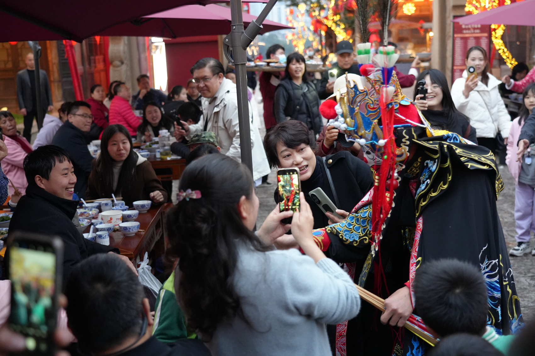 “请春酒”通常穿插民俗表演。图为等候上菜间隙,食客近距离欣赏川剧变脸。