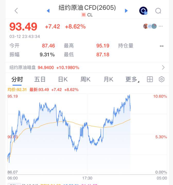 原油价格继续攀升。伊朗新任最高领袖莫杰塔巴·哈梅内伊(Mojtaba Khamenei)表示,霍尔木兹海峡应继续保持关闭状态,作为“向敌人施压的工具”。伊朗伊斯兰革命卫队海军司令在社交媒体发文称,为响应最高领袖的指示,其部队将继续封锁霍尔木兹海峡,对侵略者予以最沉重打击。国际油价12日大幅上涨。截至当天收盘,纽约商品交易所4月交货的轻质原油期货价格上涨8.48美元,收于每桶95.73美元,涨幅为9.72%;5月交货的伦敦布伦特原油期货价格上涨8.48美元,收于每桶100.46美元,涨幅为9.22%。