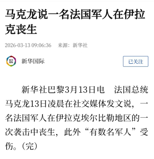 法国总统马克龙13日凌晨在社交媒体发文说,一名法国军人在伊拉克埃尔比勒地区的一次袭击中丧生,此外“有数名军人”受伤。