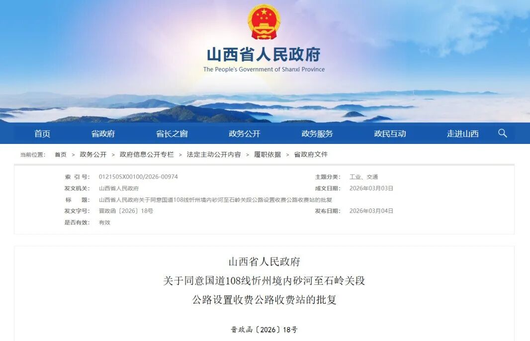 《关于国道108线忻州境内砂河至石岭关段公路设置收费公路收费站的请示》(晋交财发〔2026〕43号)收悉。现批复如下: