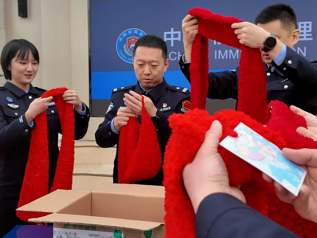 近日,天津边检总站南疆边检站值班室内收到了一个从河南安阳寄来的包裹。打开纸箱,一片“中国红”映入眼帘——10条手工编织的围巾整齐叠放,每一针都织得密实匀称。