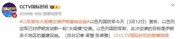以色列国防军今天(3月12日)宣布,以色列空军已对伊朗发动新一轮“大规模”空袭。以色列国防军称,此次空袭的目标是伊朗多个地区的基建设施。