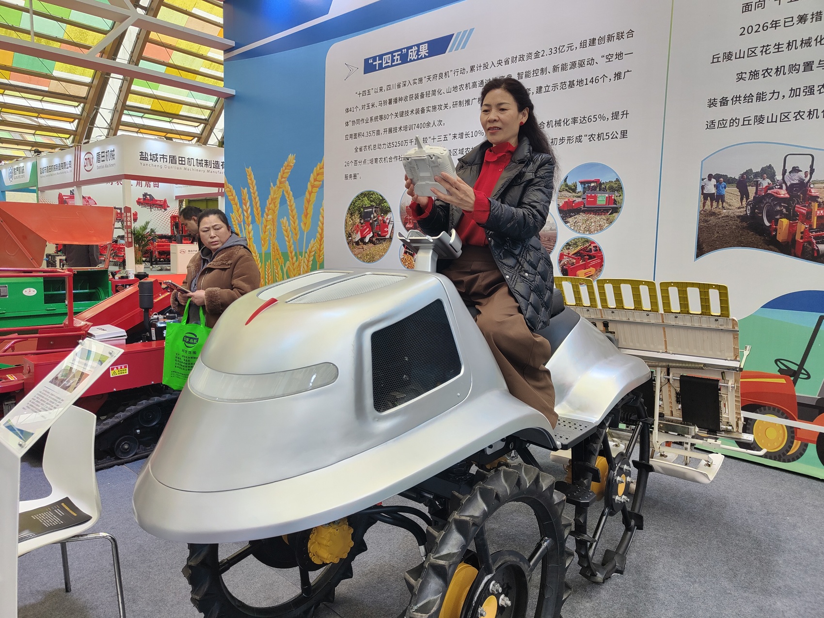 再过一个多月,即将迎来四川水稻插秧高峰期。展区内,一款颠覆传统插秧机外形的智能插秧机,引来不少观众主动合影。“太好看了,不敢相信这是农机。”一位观众迫不及待地坐上去体验,并招呼同伴为其拍照。一旁,该插秧机研制企业——四川海峰原农业机械有限公司设计负责人蒋成林介绍道:“这是我们针对丘陵山区专门研发的机型,能适应坡度地形,过台梯田很轻松,还能通过遥控器实现无人作业。”他表示,企业就是要走科技路线,改变公众对传统农机的刻板印象。