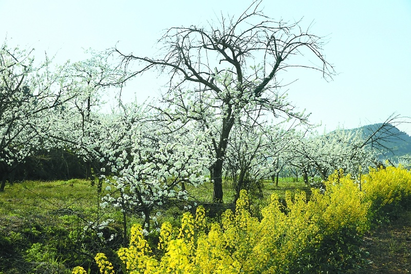 同样的春景,也在江南街道千佛岩村上演。果园里,洁白的李花与粉嫩的桃花次第绽放。游步道蜿蜒延伸,游客们徜徉其中,仿佛走进了一幅山水画。