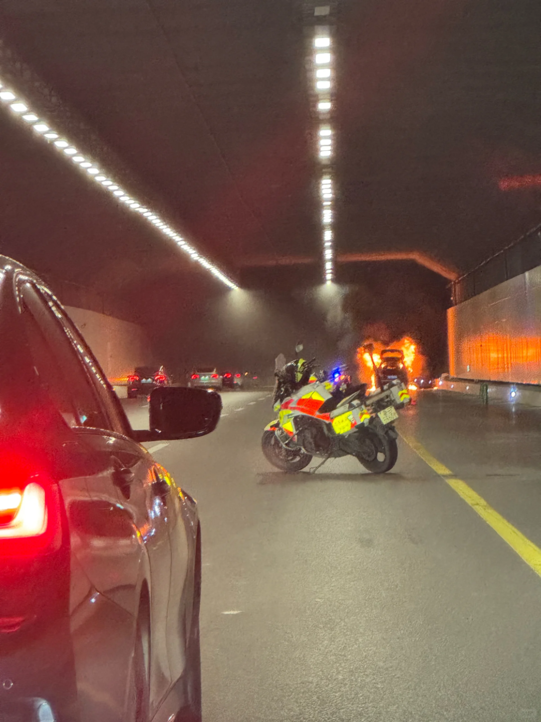 隧道内一车辆起火的画面