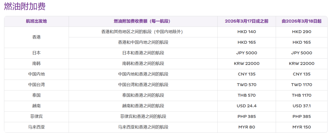 此前,香港航空宣布,自2026年3月12日起调整机票的燃油附加费,燃油附加费将按航段征收,短途及长途航线均受影响:短途航线(飞往日本、韩国、泰国、越南、印尼、新加坡、马来西亚等国家/地区的航班)由162港元增长31%至212港元;长途航线(飞往北美、欧洲、中东等国家/地区的航班)由589港元增长25%至739港元。由中国香港前往中国内地的航班燃油附加费由185港元增加至190港元,中国内地飞往香港则从145元增至150元。