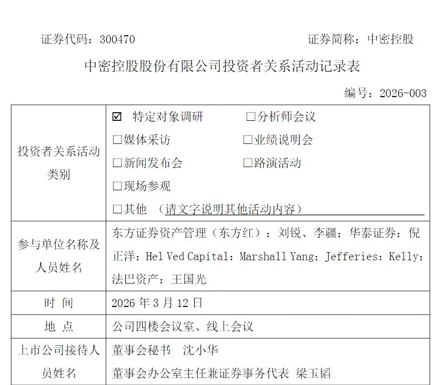 虽然业绩增长有所放缓,但中密控股(300470)依旧获得多家机构关注。据公司最新公告,3月12日多家机构对公司线上调研。值得一提的是,此次调研有多家海外投行参与。