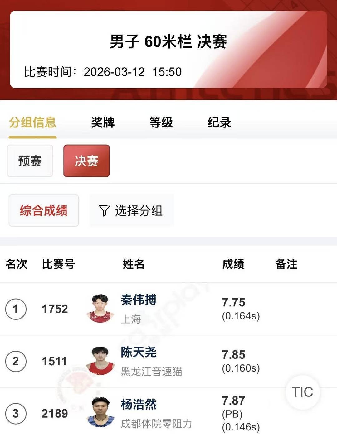 “其实我也不知道能跑什么成绩,就是来找一下比赛的感觉,顺一下,没想到就PB(个人最好成绩)了。”3月12日下午,2026年全国室内田径大奖赛成都站男子60米栏决赛结束后,来自成都体育学院的杨浩然笑着对封面新闻记者说。