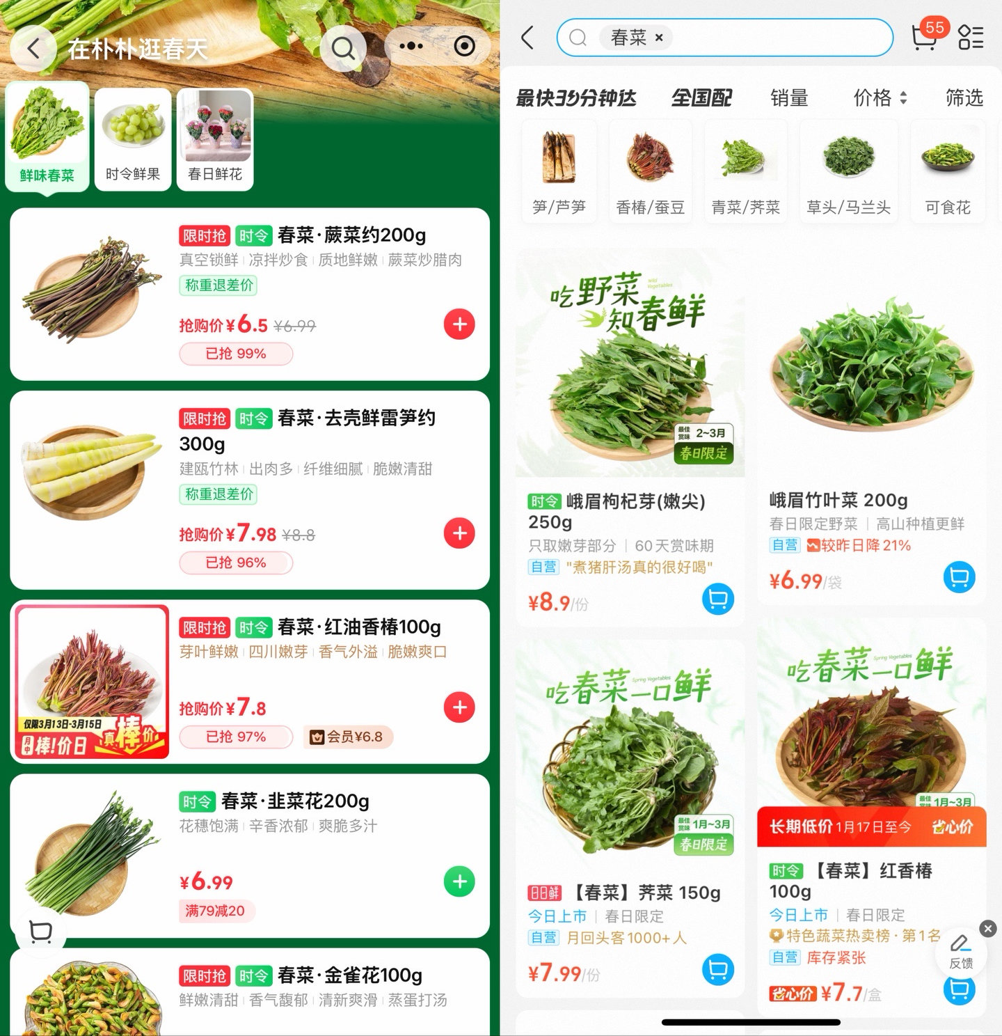 记者在盒马平台看到,平台已上线“吃春菜一口鲜”等专题,春笋、红香椿、荠菜、枸杞芽、竹叶菜等多种时令春菜集中销售。其中,红香椿100克售价约7.7元,春笋550克售价约11.9元,不少商品标注“春日限定”“库存紧张”等标签。