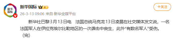 据@新华国际消息,法国总统马克龙13日凌晨在社交媒体发文说,一名法国军人在伊拉克埃尔比勒地区的一次袭击中丧生,此外“有数名军人”受伤。