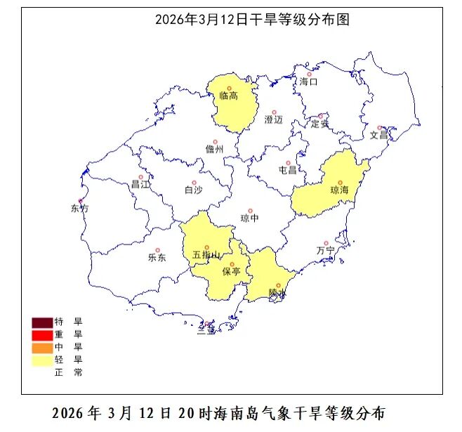 气象干旱情况:截至3月12日,临高、琼海、五指山、保亭和陵水为轻度气象干旱,其余市县处于无气象干旱状态。与3月5日相比,五指山由中旱缓解为轻旱,万宁由轻旱缓解为无旱。