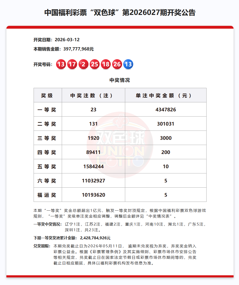 3月12日,中国福彩发布“双色球”第2026027期中奖情况,其中一等奖中奖23注: 辽宁1注,江苏2注,福建2注,重庆1注,河南10注,湖北1注,广东5注,深圳1注,单注中奖金额为:4347826元。
