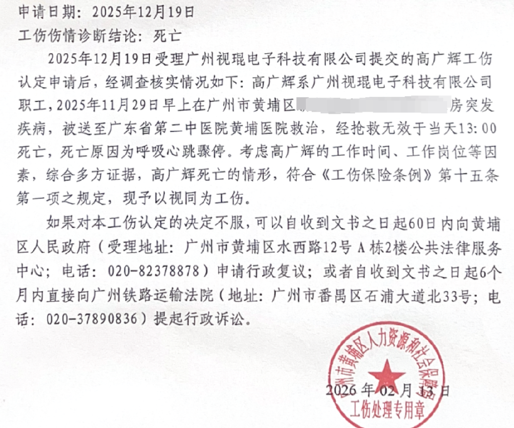 2025年12月19日,妻子杨华思通过丈夫所在公司向人社部门提交工伤认定申请。2026年2月13日,广州市⻩埔区⼈⼒资源和社会保障局在《认定工伤决定书》表示,高广辉系广州视琨电子科技有限公司(广州视源电子科技股份有限公司全资子公司)职工,2025年11月29日早上在广州市黄埔区家中突发疾病,被送至广东省第二中医院黄埔医院救治,经抢救无效于当天13:00死亡,死亡原因为呼吸心跳骤停。考虑高广辉的工作时间、工作岗位等因素,综合多方证据,高广辉死亡的情形,符合《工伤保险条例》第十五条第一项之规定,现予以视同为工伤。