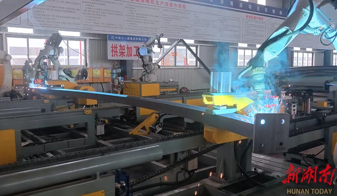 在项目的大后方,智能化有着更广泛的应用。在中铁十一局长赣高铁湖南段项目二号钢构厂,智能拱架生产线上,一名技术员在主机控制面板上输入材料厚度、半径、外弧长等数值后,一根12米长的钢构件便被机器人自动送入生产线,完成冷弯、焊接等流程,最后成为一个完整的隧道拱架,等待出库。