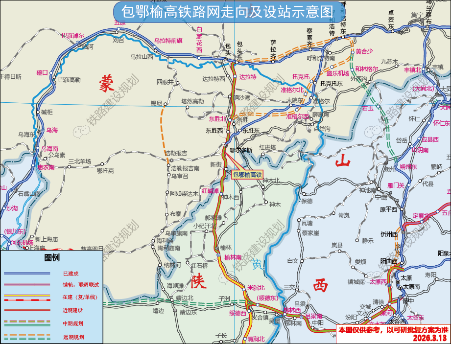 据悉,包鄂榆高铁是国家“八纵八横”包(银)海高铁主通道的最北段,也是唯一未批复段落。其中包鄂段于2023年4月份由国铁集团启动勘察设计,目前预可研已编制完成;鄂榆段由原规划延榆鄂高铁拆分而来,可研报告2023年已审查并完成鉴修稿。两段合并建设后需重新履行预可研及可研审查及报批程序。