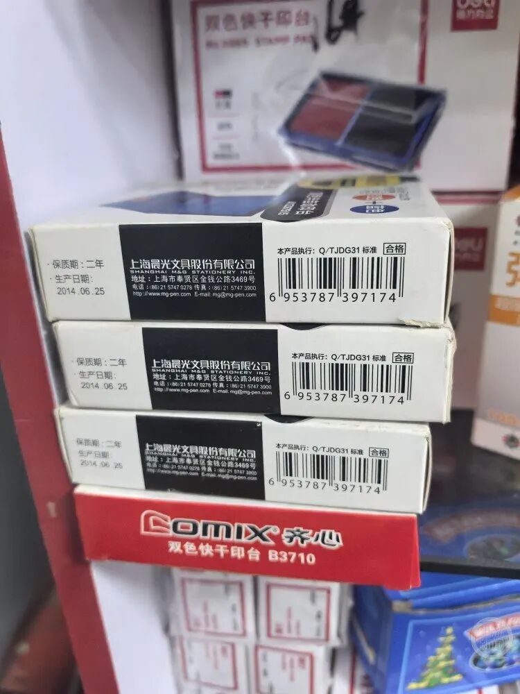 “晨光牌双色半自动印台”过期9年,仍在售卖;“晨光牌印泥油”过期6年,仍在售卖;“金领印泥油”过期5年仍在售卖……