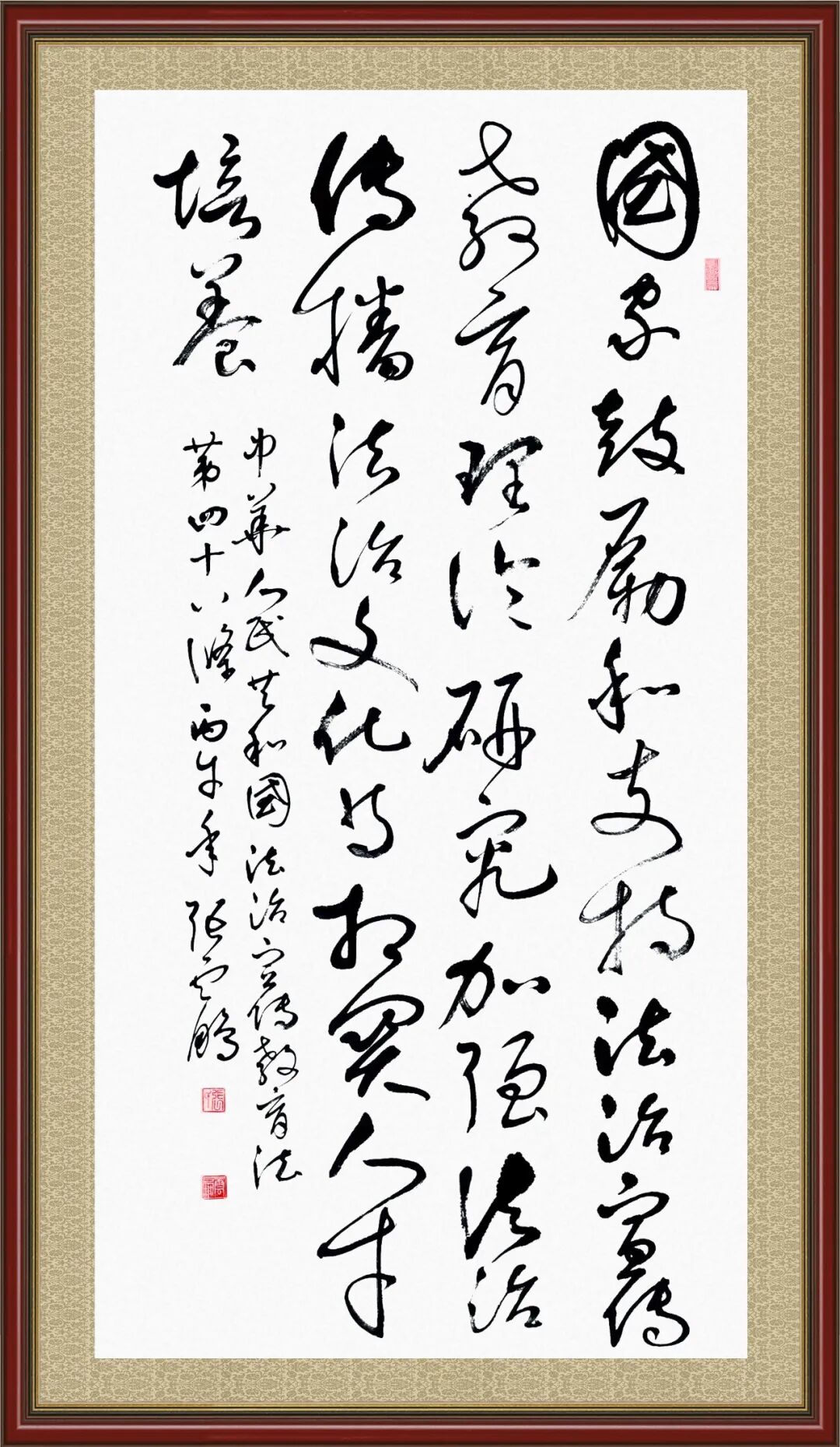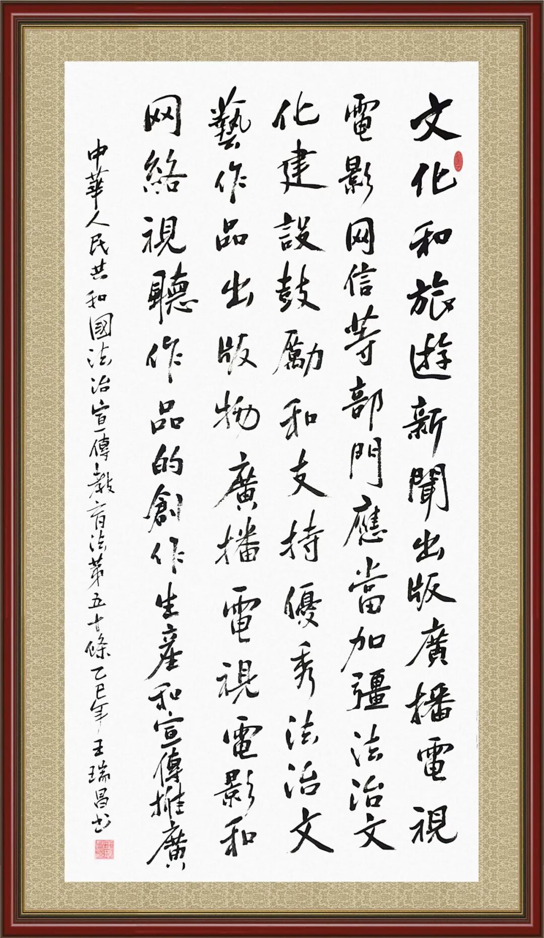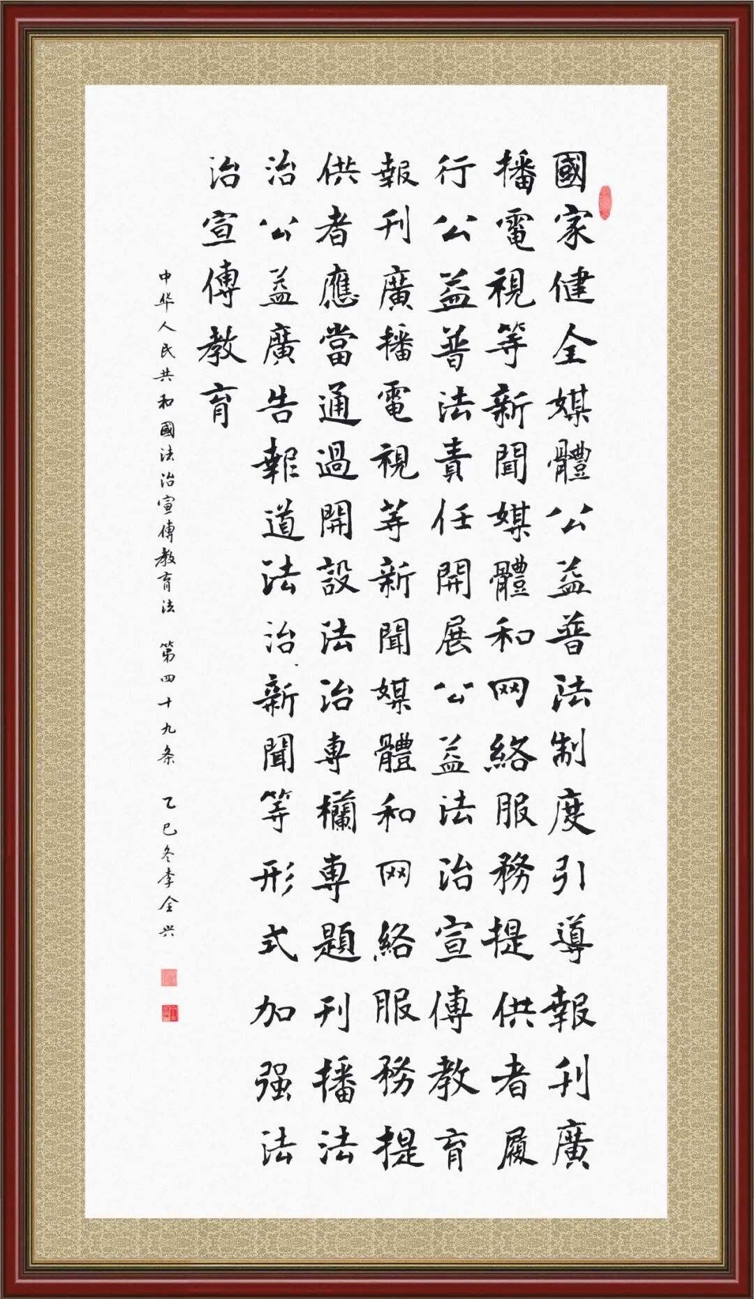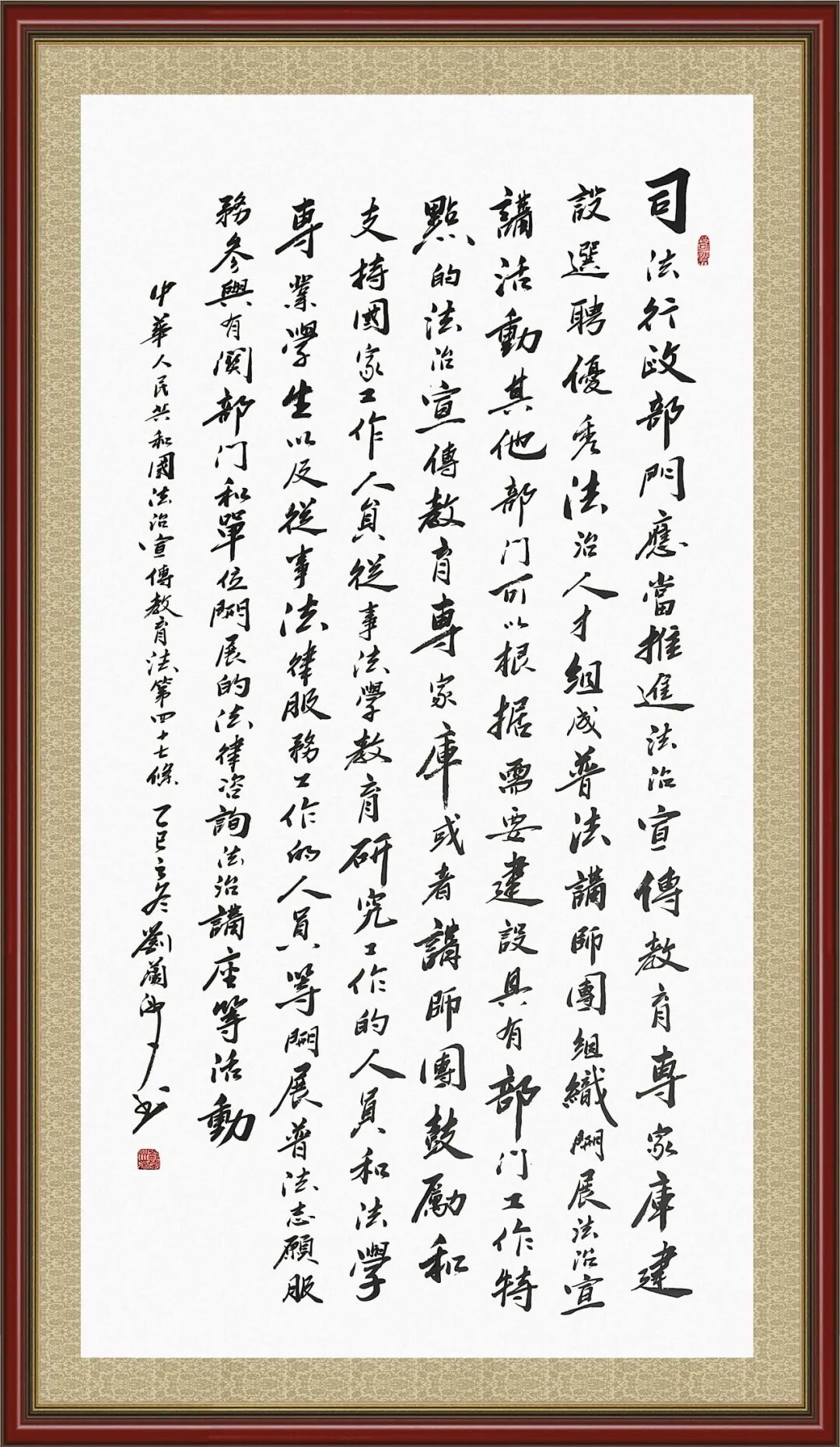 2020年7月11日,由法治日报社主办的“书·法”系列活动正式启动,先后书写《中华人民共和国民法典》《中华人民共和国宪法》《中华人民共和国民营经济促进法》等21部法律法规。