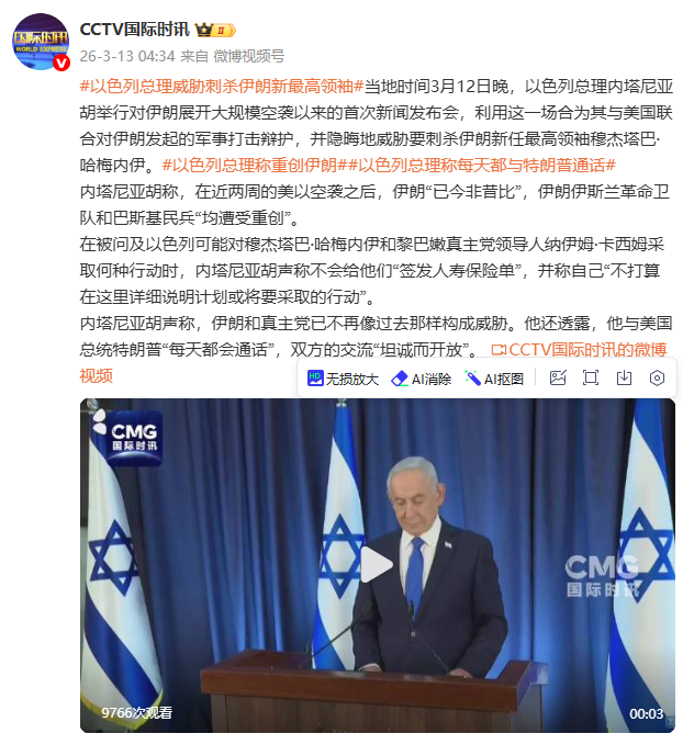 据@CCTV国际时讯报道,当地时间3月12日晚,以色列总理内塔尼亚胡举行对伊朗展开大规模空袭以来的首次新闻发布会,利用这一场合为其与美国联合对伊朗发起的军事打击辩护,并隐晦地威胁要刺杀伊朗新任最高领袖穆杰塔巴·哈梅内伊。