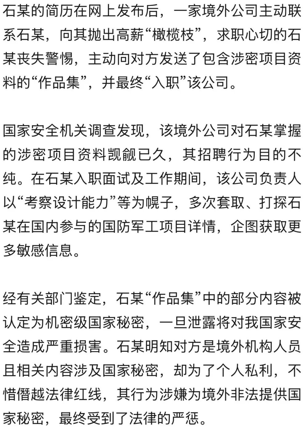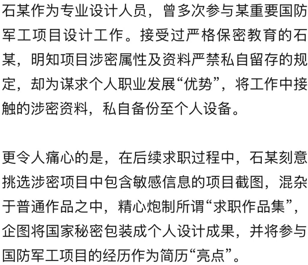 一份为境外求职精心准备的个人“作品集”,竟触犯法律红线!国家安全机关近日依法查处一起重要案件:曾参与某重要国防军工项目设计的专业人员石某,因非法持有并向境外提供国家秘密,被国家安全机关依法采取强制措施。