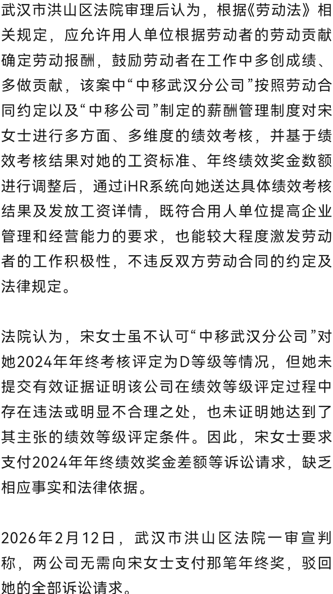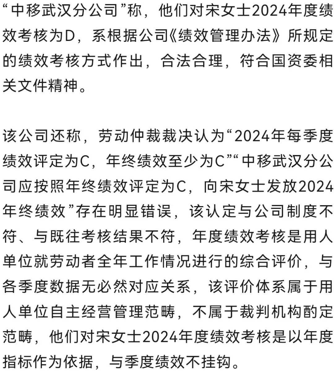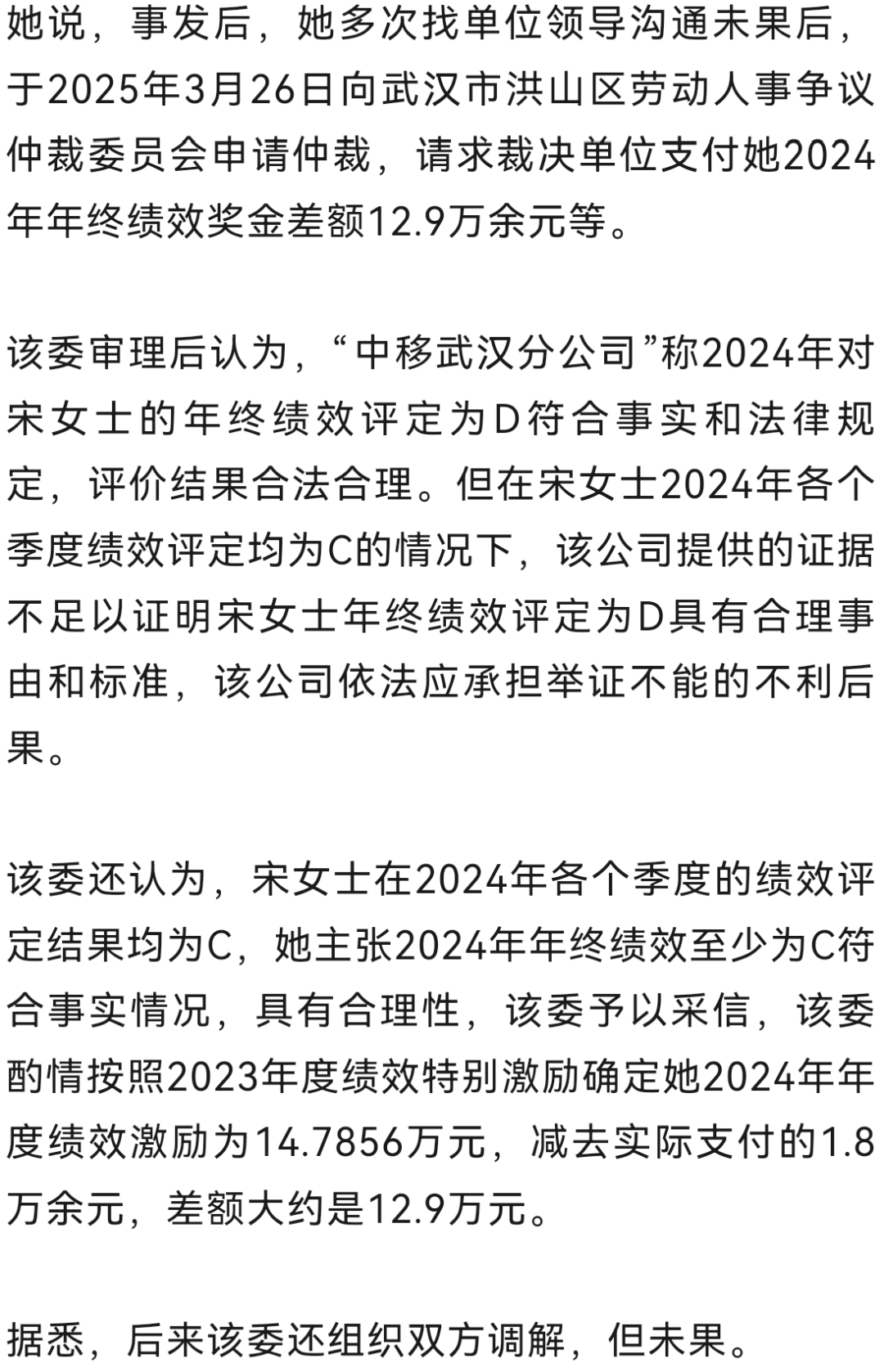 2025年5月27日,该委出具仲裁裁决书称,自该裁决生效之日起7日内,“中移公司”和“中移武汉分公司”共同向宋女士支付少发放的2024年度绩效激励12.9万余元。
