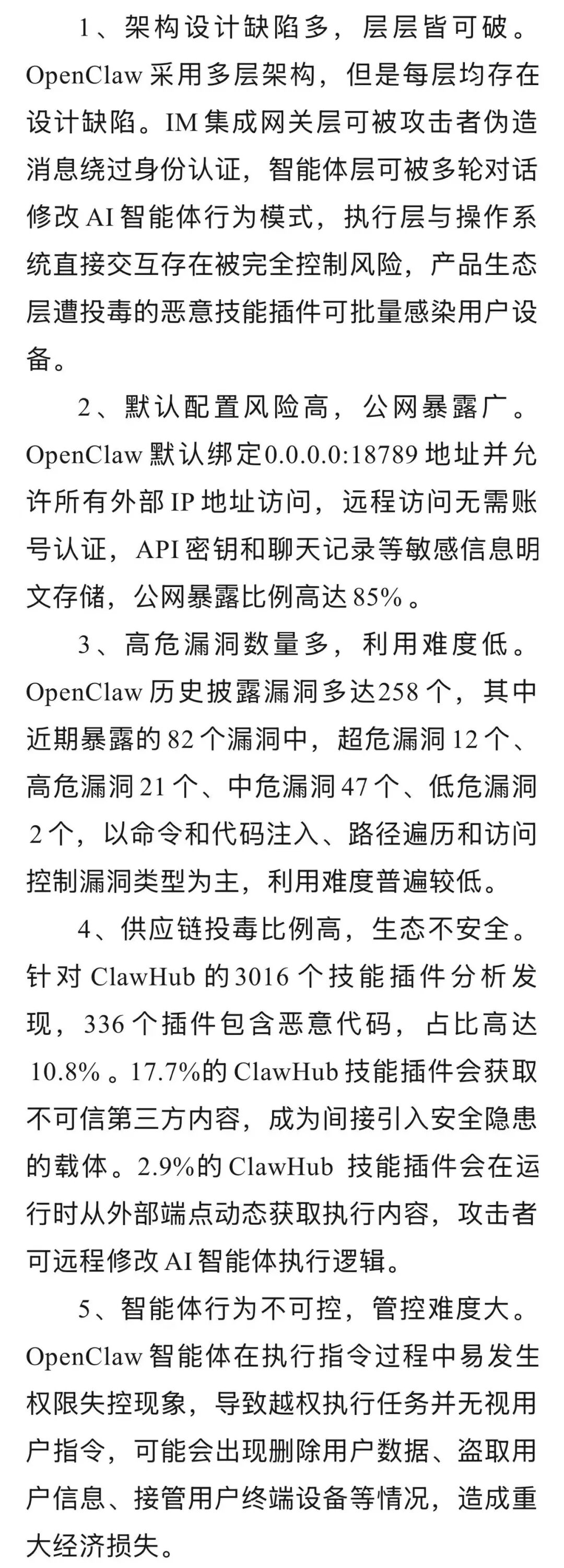 OpenClaw在架构设计、默认配置、漏洞管理、插件生态、行为管控等方面存在较大安全风险,一旦被攻击者利用,可能导致服务器被控制、敏感数据泄露等严重安全问题。