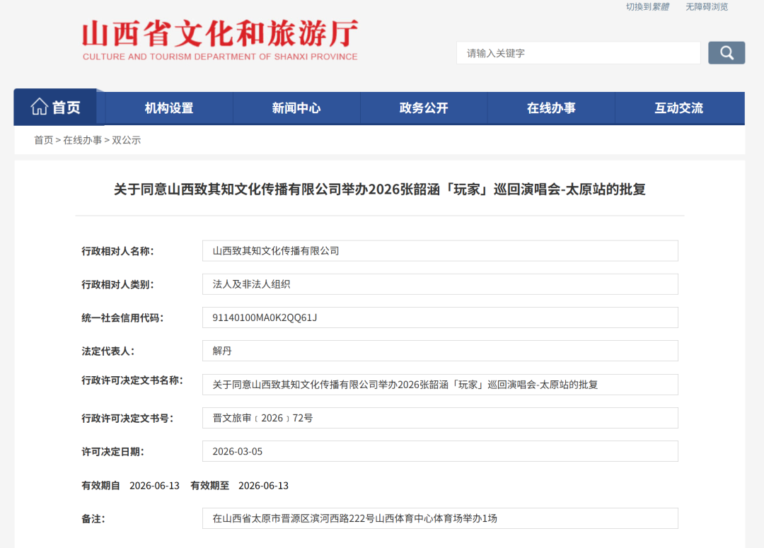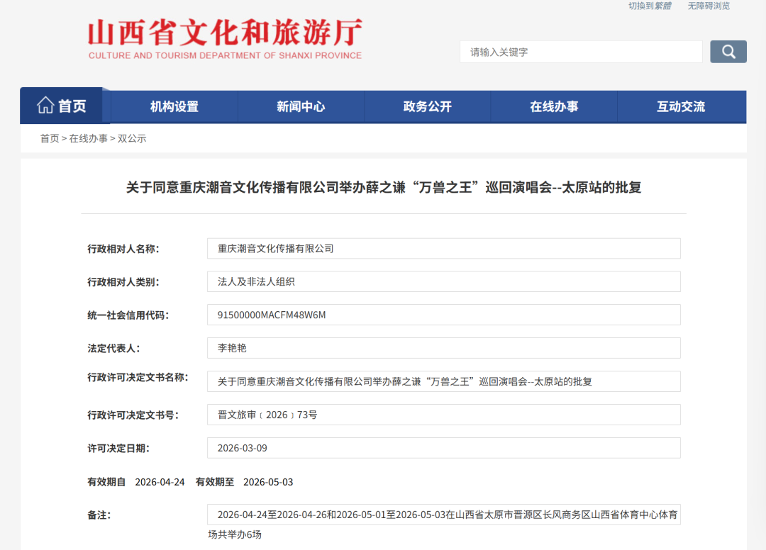 日前,山西省文化和旅游厅批复了同意山西致其知文化传播有限公司举办2026张韶涵「玩家」巡回演唱会—太原站和重庆潮音文化传播有限公司举办薛之谦“万兽之王”巡回演唱会—太原站。