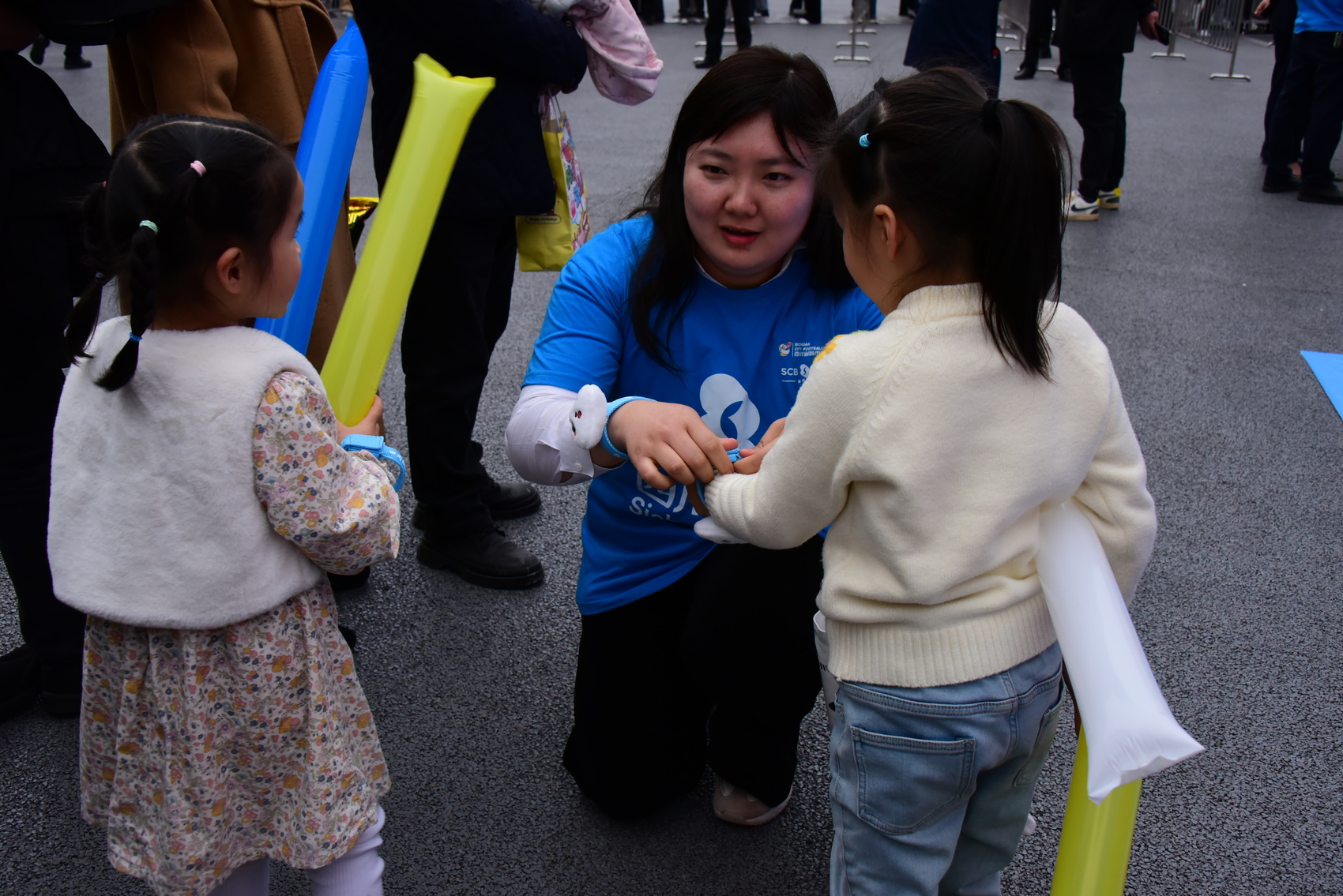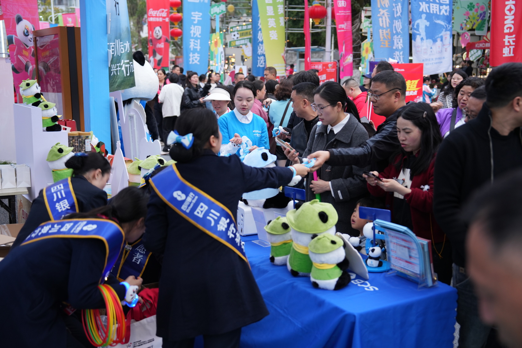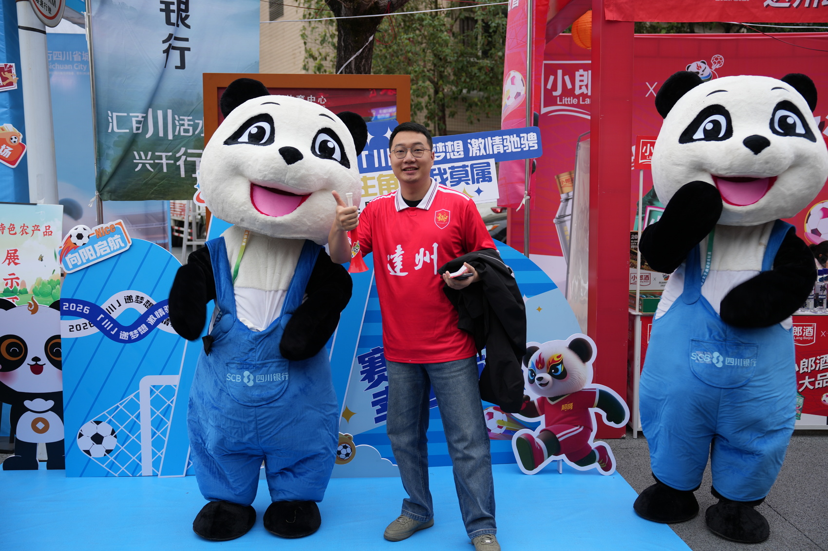 活动现场,憨态可掬的人形玩偶成为最受球迷欢迎的“显眼包”。可爱的熊猫人偶穿梭在人群中,时而与小朋友击掌互动,时而配合球迷合影留念,还不忘向观众派发文创手环,为即将开赛的球场增添了几分欢乐与童趣。不少球迷争相与玩偶拥抱合影,现场欢笑声不断。“孩子看到熊猫玩偶特别兴奋,拉着我一起拍照,这样的互动让看球氛围更轻松有趣了。”一位带着孩子观赛的家长说道。