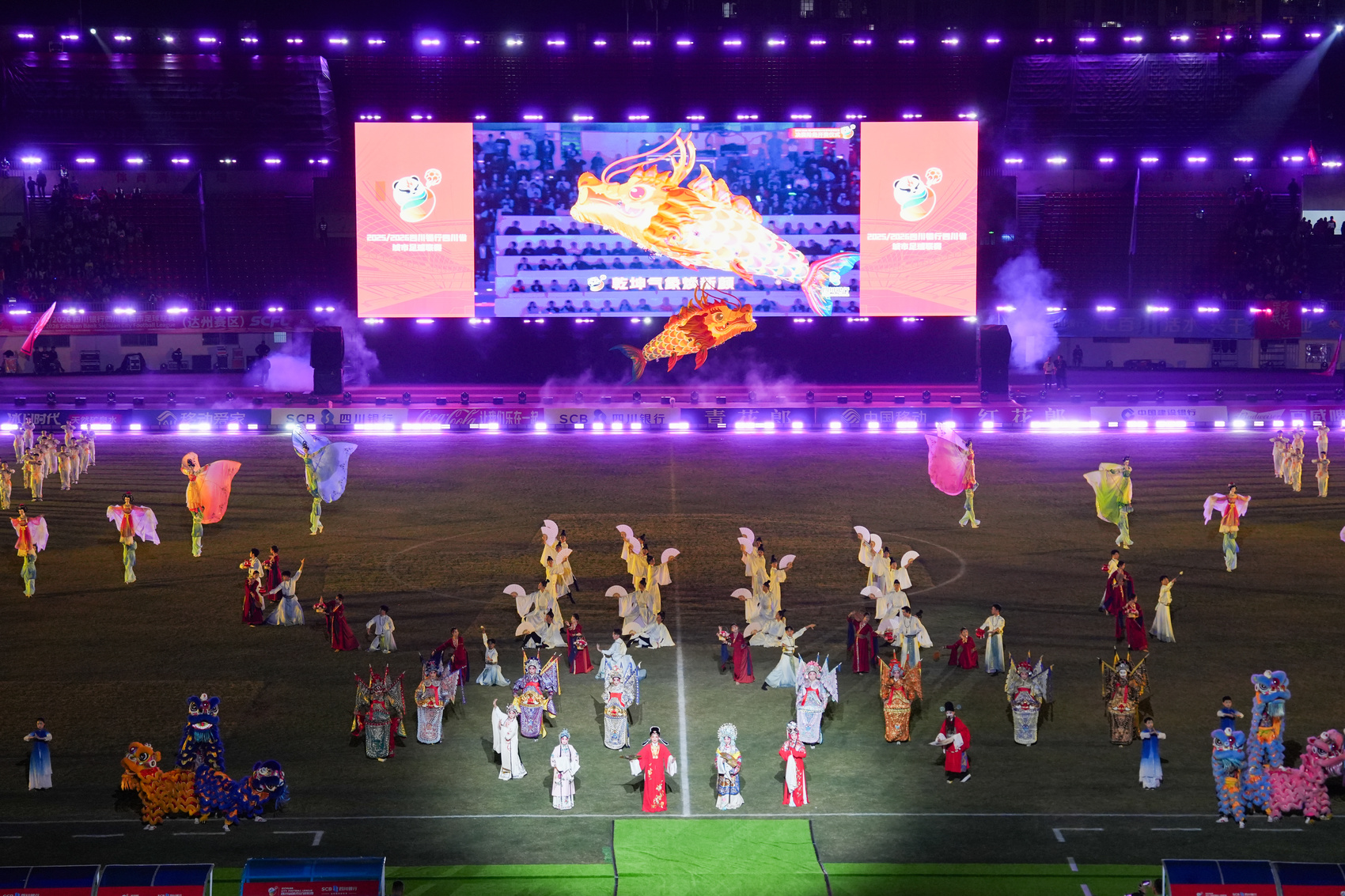 随着6位骑手策马入场,“旗开得胜”马术秀与开场片《马力全开》交织,重现川超赛事的高光瞬间与21个市州球队的拼搏风采;节目《四海同歌》融合川剧、大木偶、蜀绣等巴蜀非遗元素,让传统艺术与赛场激情碰撞;《巴风賨韵》以巴人战歌为基底,融合板凳龙舞、发光蹴鞠等元素,串联起古代竞技与现代足球的体育血脉,尽显达州本土文化魅力;《高腔》创新融合“摇滚+非遗”,歌手江映蓉与四川省级非遗福宝石工号子代表性传承人何怒涛、泸州市合江县福宝贯打唢呐团队等合作,将泸州合江石工号子的夯土之力与川南“贯打唢呐”的高亢之音创造性融合,为“川超”赛场注入震撼心灵的巴蜀回响。