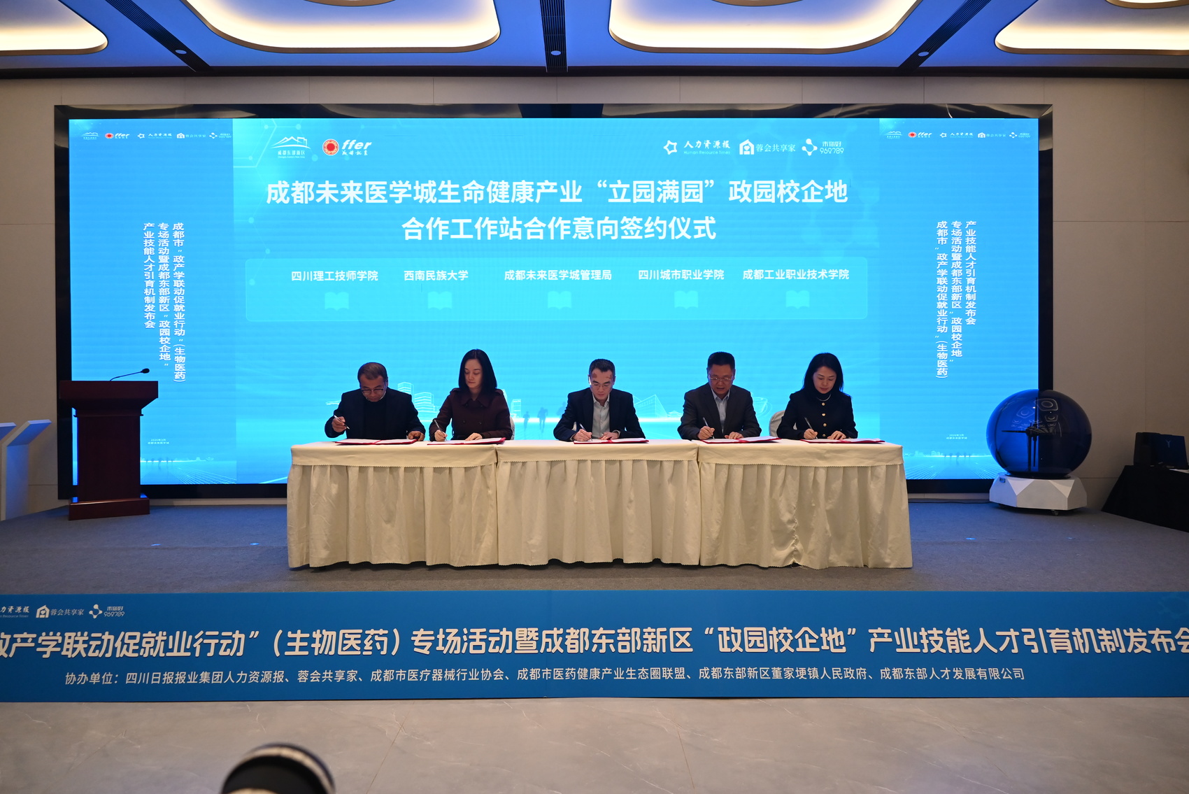 活动中,成都市“蓉易就业”未来医学城园区站正式启动,集成政策咨询、岗位推送等四大核心功能,打造园区“15分钟就业服务圈”;未来医学城管理局与多所合作院校签订合作意向,搭建政园校企地合作工作站,推动校企资源常态化对接;生物医药企业代表、在蓉高校代表与成都市就业局、市教育局、市经信局共同签署《成都市校、企、地“政产学联动促就业行动”倡议书》,建立人才共育、资源共投、成果共享的创新机制,打造生物医药产教融合“成都样板”。