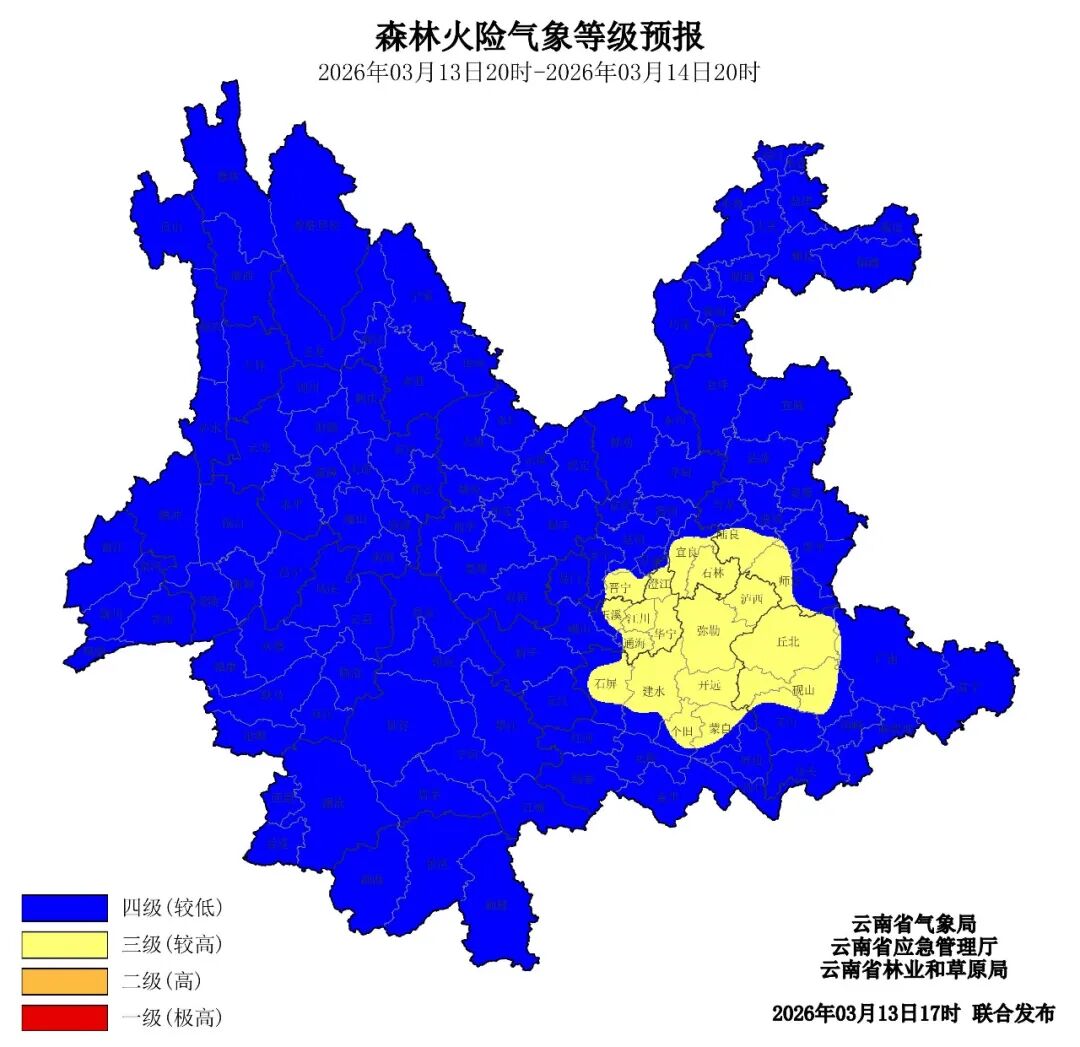 2026年3月13日20时至2026年3月14日20时,昆明市南部、玉溪市中部和东部、红河州中部和北部三级、文山州西北部、曲靖市西南部三级(较高),其他地区四级(较低)。