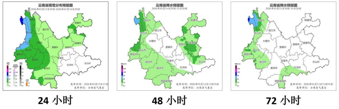 3月13日20时到3月14日20时:怒江州、迪庆州西部、保山市、德宏州、临沧市、普洱市北部、大理州西部阴有中到大雨局部暴雨,迪庆州北部高海拔地区有小雪或雨夹雪,昭通市、曲靖市北部、昆明市北部、楚雄州、玉溪市西部、普洱市南部、西双版纳州、大理州东部、丽江市、迪庆州东部阴有小雨局部中雨,其他地区多云。