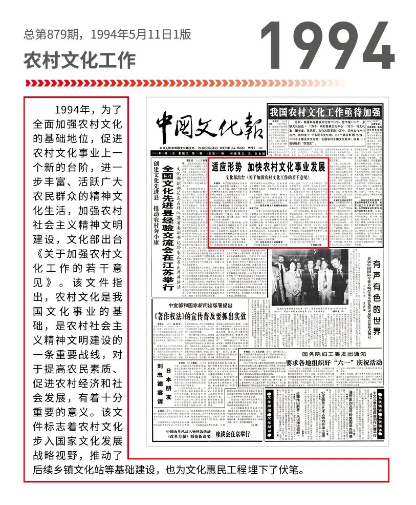 1994年,为了全面加强农村文化的基础地位,促进农村文化事业上一个新的台阶,进一步丰富、活跃广大农民群众的精神文化生活,加强农村社会主义精神文明建设,文化部出台《关于加强农村文化工作的若干意见》。该文件指出,农村文化是我国文化事业的基础,是农村社会主义精神文明建设的一条重要战线,对于提高农民素质、促进农村经济和社会发展,有着十分重要的意义。该文件标志着农村文化步入国家文化发展战略视野,推动了后续乡镇文化站等基础建设,也为文化惠民工程埋下了伏笔。