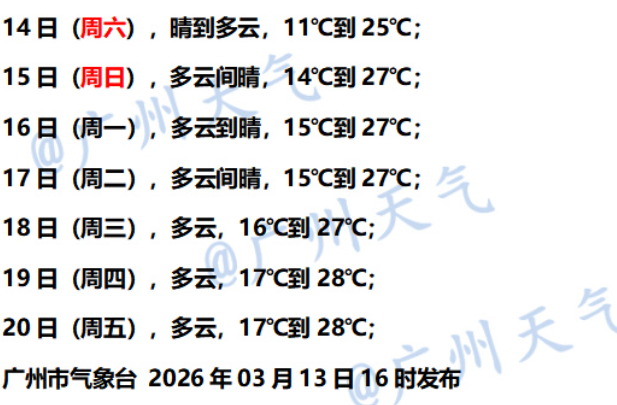 广州市气象台预计,未来三天广州市天晴干燥持续,15日—16日气温逐渐上升,最高气温25℃上升至27℃,最低气温11℃上升至15℃。