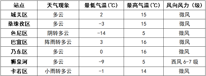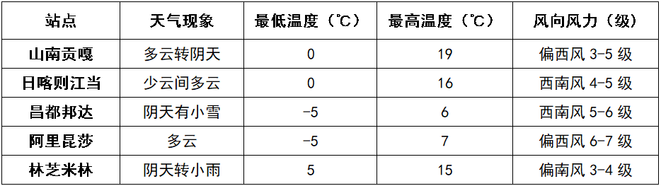24小时趋势预报:今日夜间:林芝、山南南部和日喀则南部有小雨(雪),部分地方有中雪(雨),其中墨脱、波密和察隅高海拔地方有大到暴雪;日喀则东部、拉萨东部、山南东部、昌都中部和南部阴天有小雪(雨),部分地方有中雪;昌都北部和那曲东部多云间阴天,部分地方有分散性阵雪;其他地方多云。明日白天:林芝和昌都阴天有小雪(雨),部分地方有中雪(雨);那曲东部、山南南部、拉萨东部和日喀则南部多云间阴天,部分地方有阵雪;其他地方少云间多云。那曲、阿里、日喀则西部和南部有7至8级大风,局地阵风可达9至11级;沿雅鲁藏布江一线和昌都有4至5级阵风。