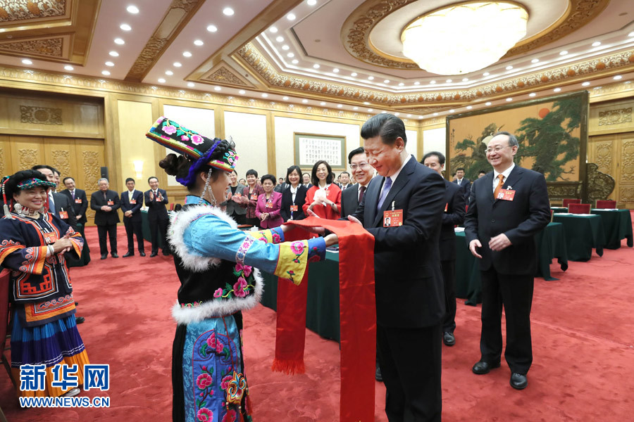 2017年3月8日,中共中央总书记、国家主席、中央军委主席习近平参加十二届全国人大五次会议四川代表团的审议。习近平走进会场时,身着民族服装的藏族、彝族、羌族代表向总书记问好。这是羌族代表献上鲜艳的羌红。新华社记者 兰红光 摄