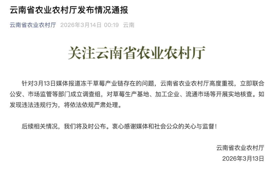 13日,针对有媒体报道冻干草莓产业链存在的问题,云南省农业农村厅发布情况通报:已联合公安、市场监管等部门成立调查组,对草莓生产基地、加工企业、流通市场等开展实地核查。如发现违法违规行为,将依法依规严肃处理。