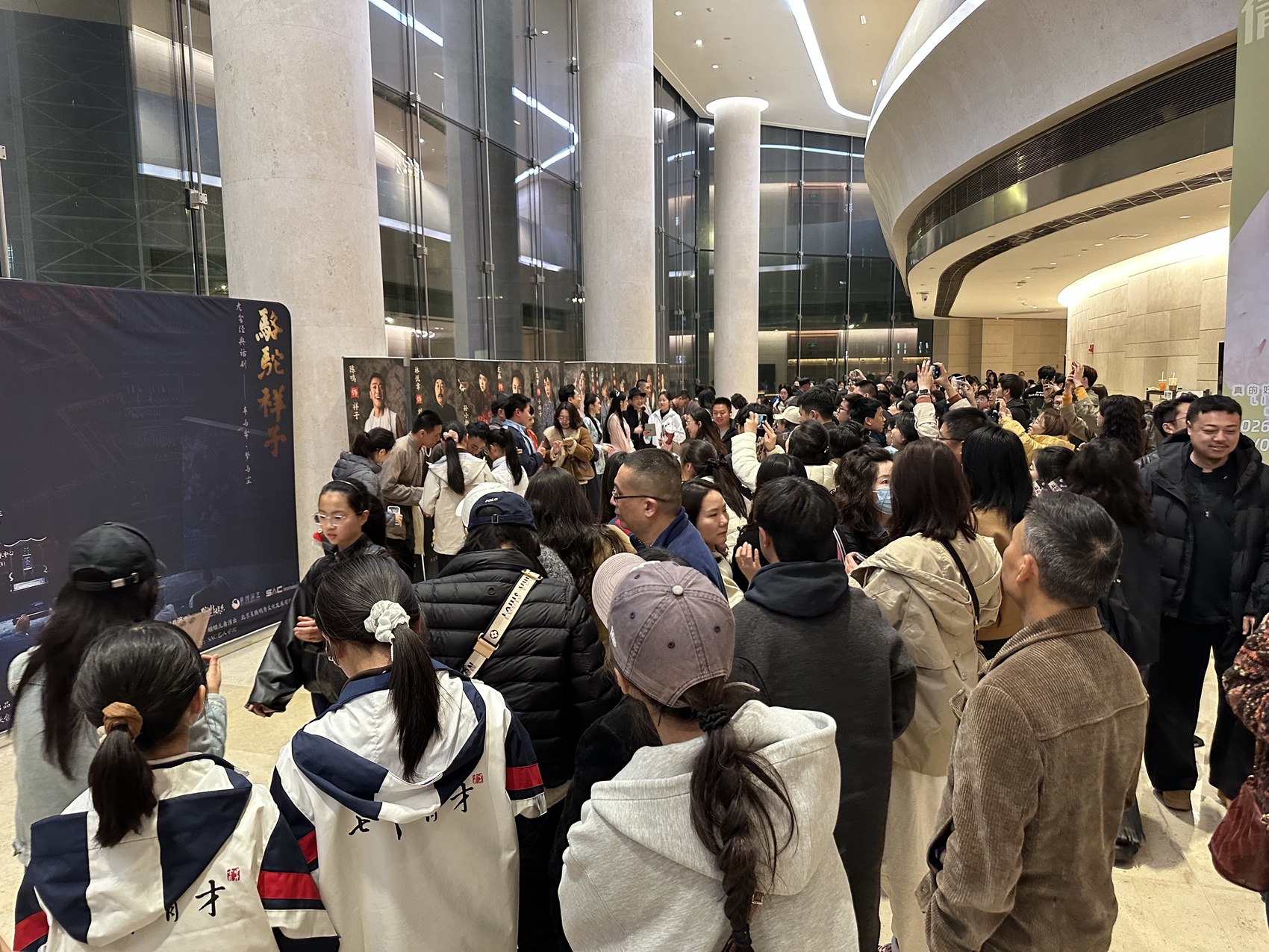 2026年3月13日晚,在成都城市音乐厅,观众与话剧《骆驼祥子》演员合影。