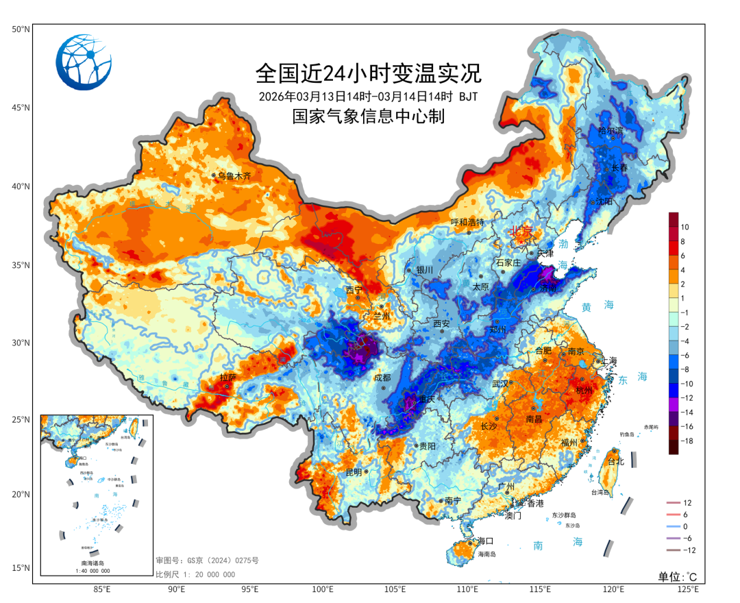 气温方面,今天冷空气依然“在线”,青海、甘肃、四川交界以及重庆西部、山东西北部等地局地都出现了超过13℃的剧烈降温。截至16时,兰州最高气温6.2℃,较常年同期明显偏低,可以说冷得很“认真”。