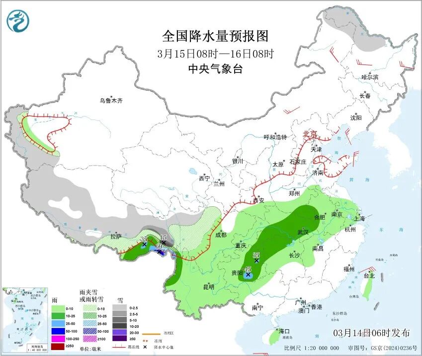 具体来看,3月14日,内蒙古东北部、黑龙江东北部、新疆南疆西部山区、西藏东部和南部、川西高原、青海北部和东部、甘肃南部、宁夏南部、陕西中北部、山西中北部等地部分地区有小到中雪或雨夹雪,其中,甘肃东部、秦岭西部、山西中部、西藏东部等地部分地区有大到暴雪。西藏东南部、陕西南部、山西南部、河南西部、湖北西部、四川东北和南部、重庆、贵州北部、云南西部等地部分地区有中到大雨,其中,西藏东南部、四川盆地东部等地局部地区有暴雨。