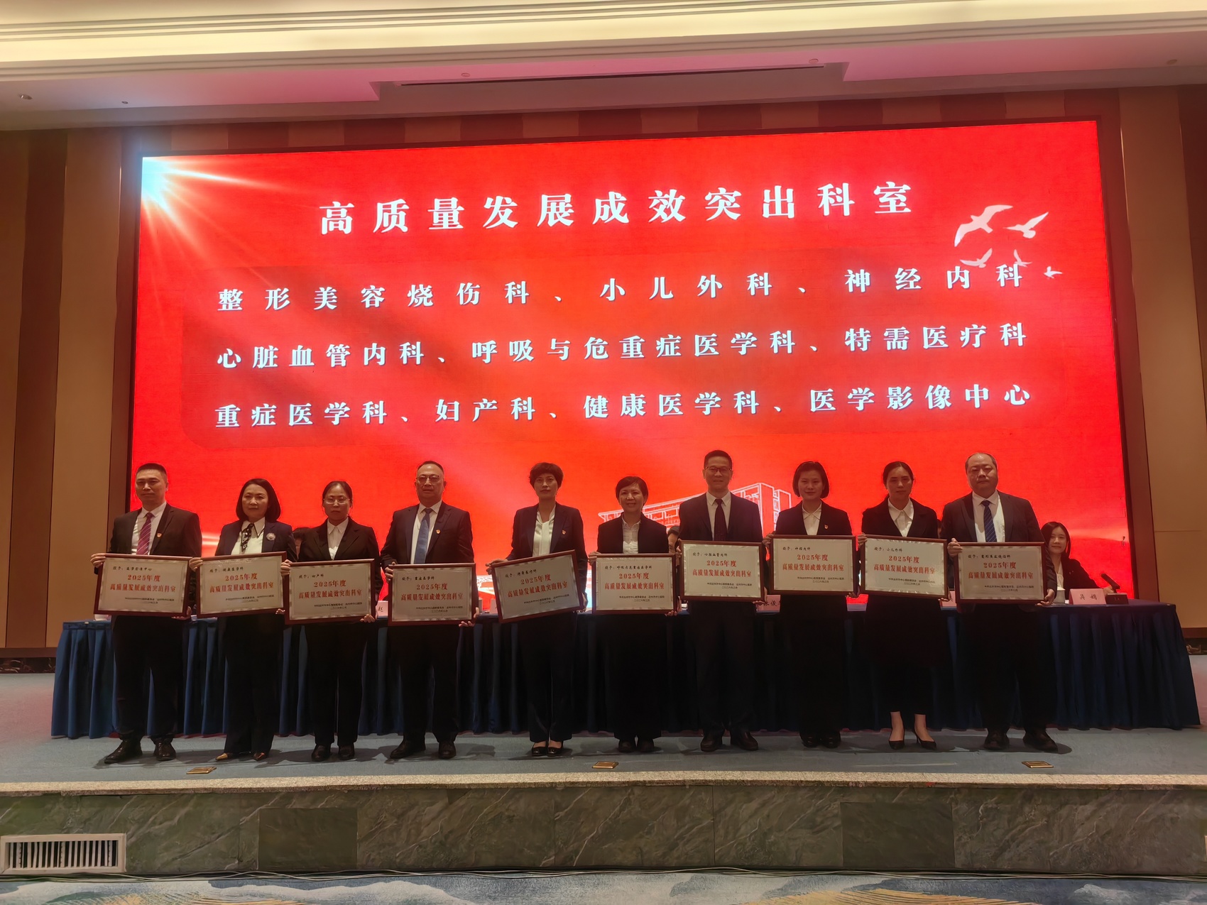 会议现场,达州市中心医院党委专职副书记赵毅宣读了《达州市中心医院关于表扬2025年度成绩突出集体和表现突出个人的决定》《达州市中心医院关于表扬2025年度优秀三方服务人员的决定》,并现场为获得高质量发展成效突出科室、精神文明建设成效突出科室等10类奖项的先进集体和个人进行隆重的表扬颁奖。