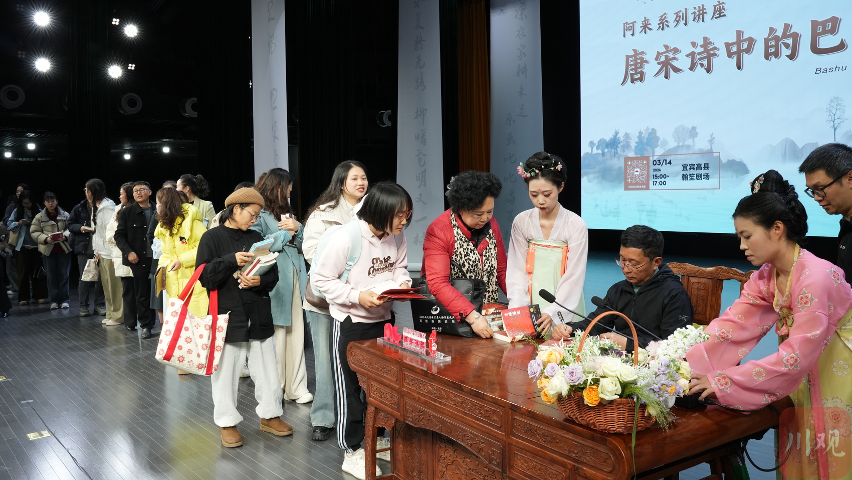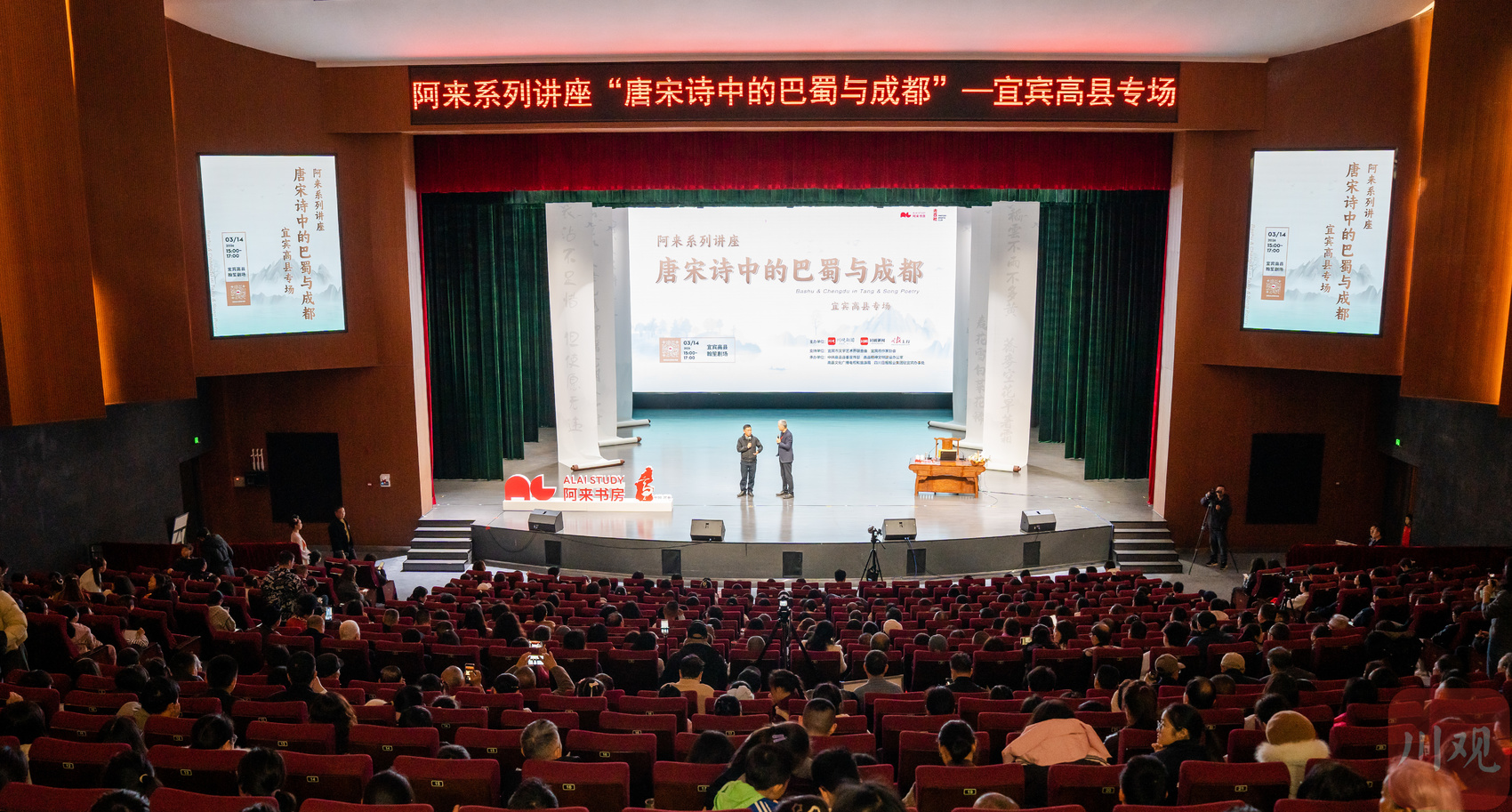 3月14日下午,宜宾市高县细雨绵绵,书迷们的热情却丝毫未减,翰笙剧场内人头攒动,有手捧阿来新书期待签名的青年学生,有牵着孩子慕名而来的父母,还有专程从外地驱车赶来的忠实读者。阿来系列讲座“唐宋诗中的巴蜀与成都”——宜宾高县专场活动在此举行,600余名观众齐聚一堂,共赴一场唐宋诗与巴蜀田园的文化之约。