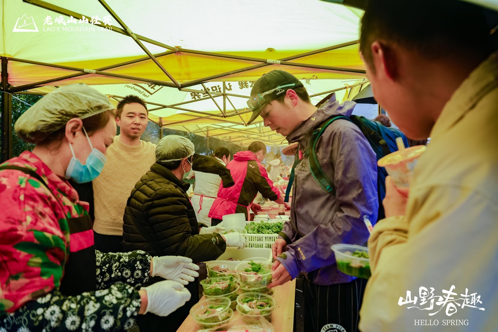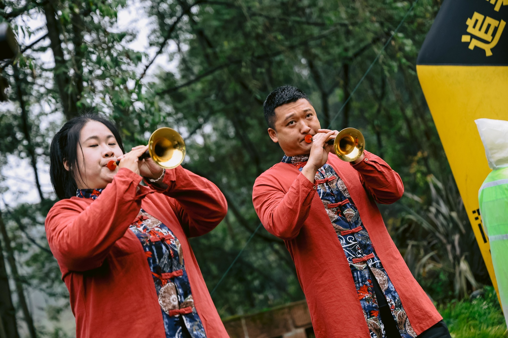 这样的用心设计遍布赛道每一处:在幸福古村赵桥点位,村民竹篮里装满丹棱耙耙柑与特色山货,边递特产边呐喊助威,身旁梨花盛放。骆大坪补水点,工作人员手持铜锣,用十足的热情“咣咣”敲响,为每一位经过的选手加油打气;黄包山区域,就地取材的野花搭建起花环打卡装置,志愿者现场带领选手体验编花环,解锁山野趣味。