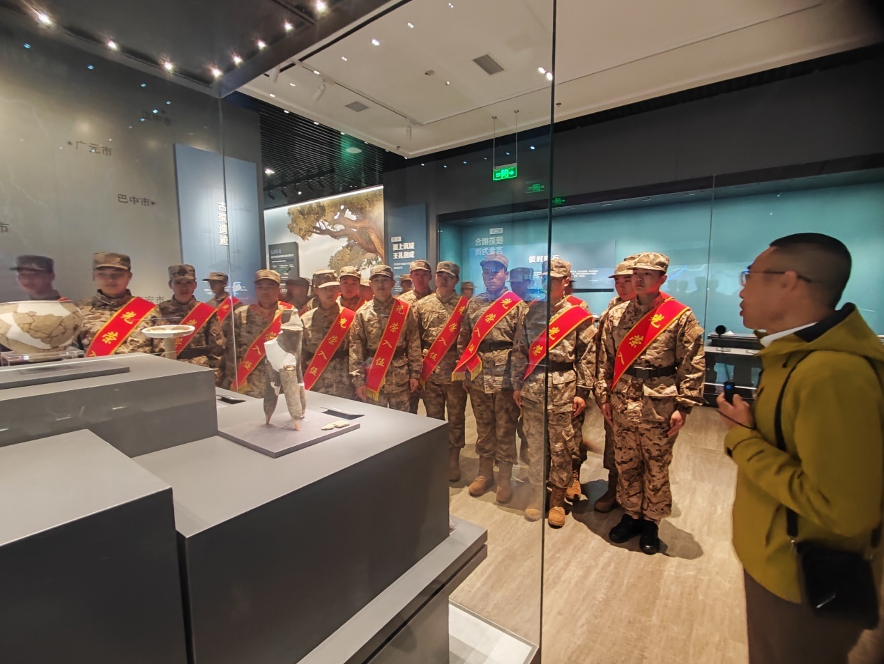 活动开始前,新兵列队走进广都博物馆,在曾在部队服役十年、现任广都博物馆文史专家的解说员的引领下参观历史展陈。凝视着馆藏的古蜀文物,新兵们的眼神中多了一份凝重与坚定。