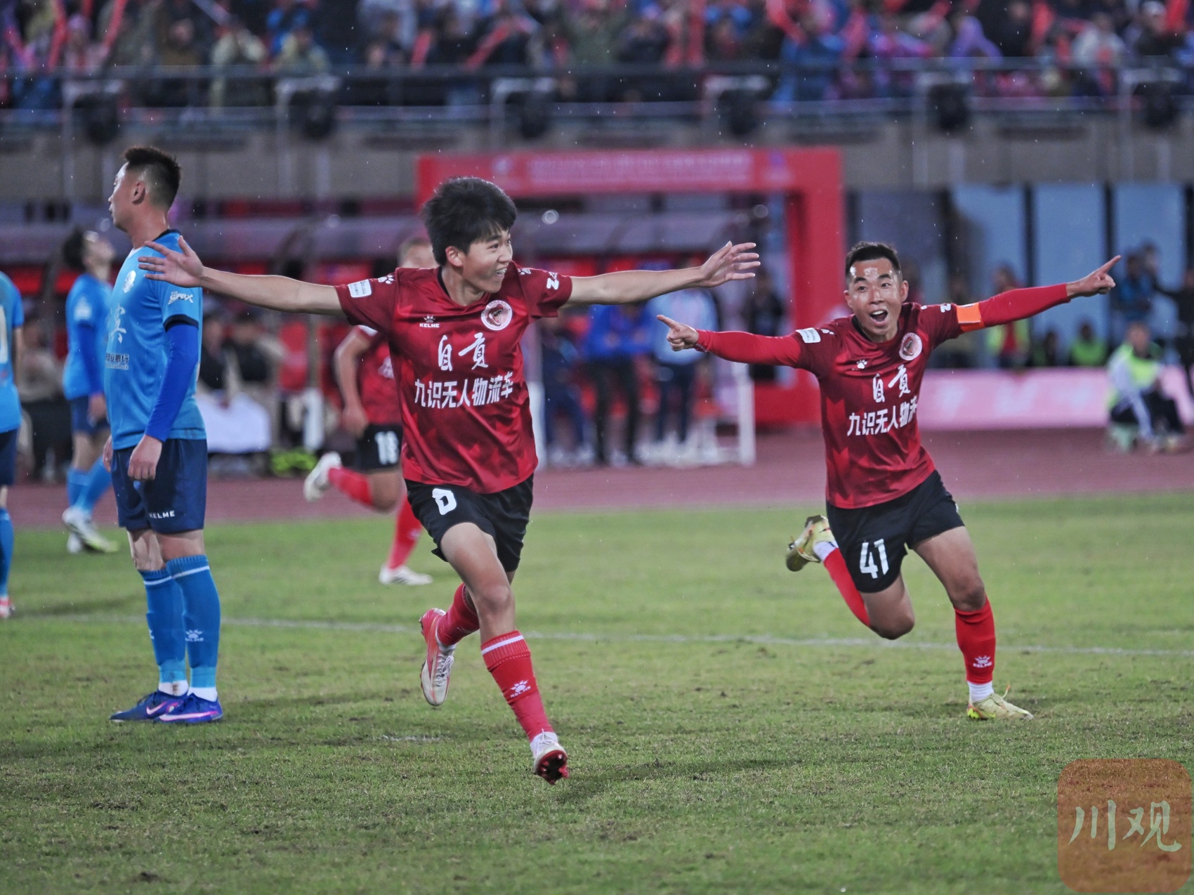 自贡队队员进球后欢庆。