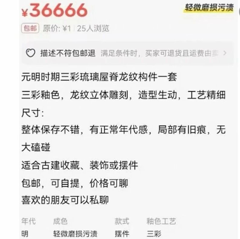 据大皖新闻报道,二手平台的一家店铺内,有人销售“元明时期三彩琉璃屋脊龙纹构件一套”,挂价36666元,而这套构件疑似全国重点文物保护单位夏禹神祠的正脊琉璃。