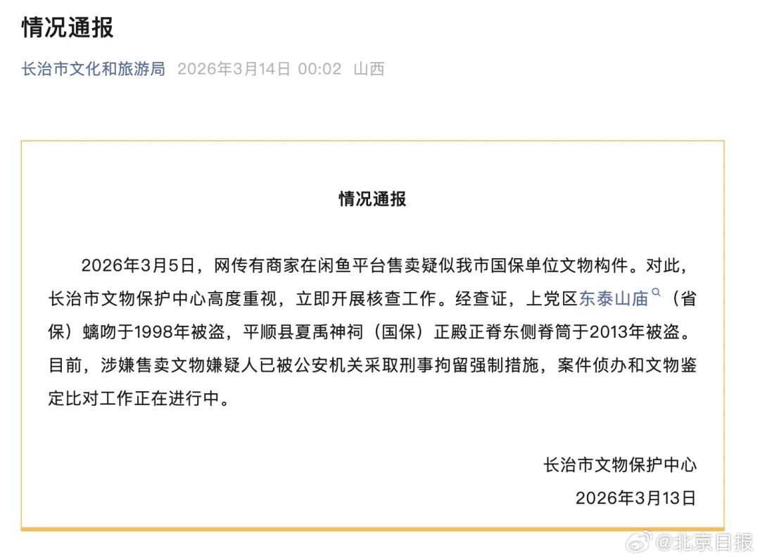 2026年3月5日,网传有商家在闲鱼平台售卖疑似我市国保单位文物构件。对此,长治市文物保护中心高度重视,立即开展核查工作。经查证,上党区东泰山庙(省保)螭吻于1998年被盗,平顺县夏禹神祠(国保)正殿正脊东侧脊筒于2013年被盗。目前,涉嫌售卖文物嫌疑人已被公安机关采取刑事拘留强制措施,案件侦办和文物鉴定比对工作正在进行中。