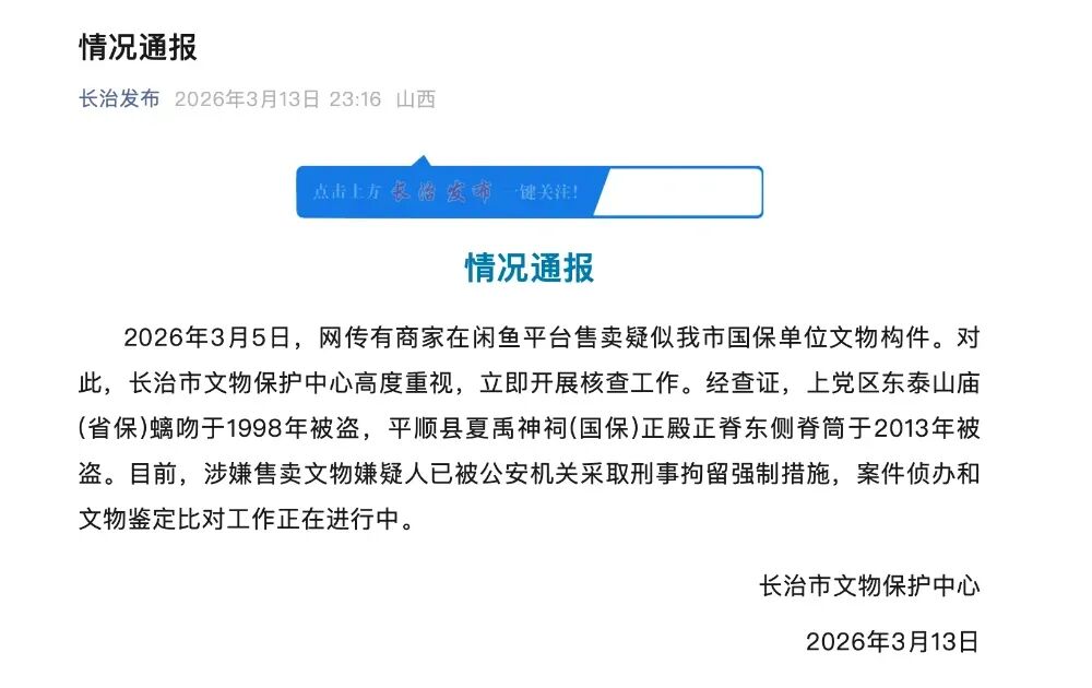 2026年3月5日,网传有商家在闲鱼平台售卖疑似我市国保单位文物构件。对此,长治市文物保护中心高度重视,立即开展核查工作。经查证,上党区东泰山庙(省保)螭吻于1998年被盗,平顺县夏禹神祠(国保)正殿正脊东侧脊筒于2013年被盗。目前,涉嫌售卖文物嫌疑人已被公安机关采取刑事拘留强制措施,案件侦办和文物鉴定比对工作正在进行中。