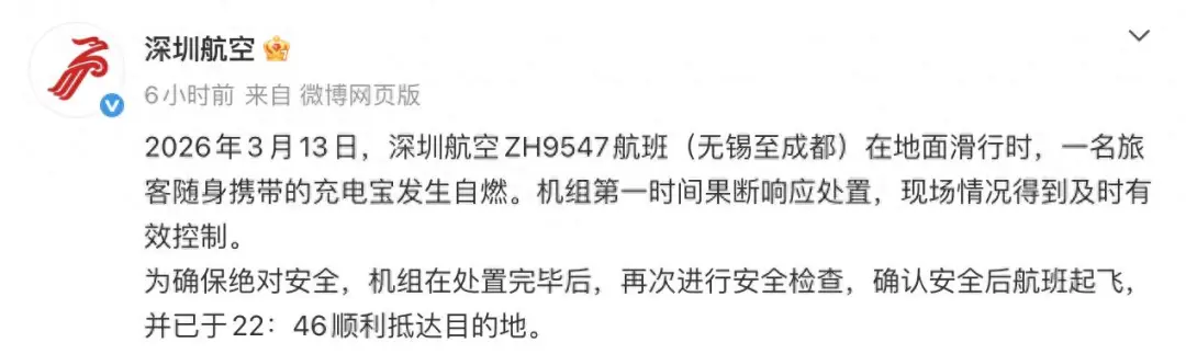 3月14日,@深圳航空 发文称,3月13日,深圳航空ZH9547航班(无锡至成都)在地面滑行时,一名旅客随身携带的充电宝发生自燃。机组第一时间果断响应处置,现场情况得到及时有效控制。为确保绝对安全,机组在处置完毕后,再次进行安全检查,确认安全后航班起飞,并已于22:46顺利抵达目的地。