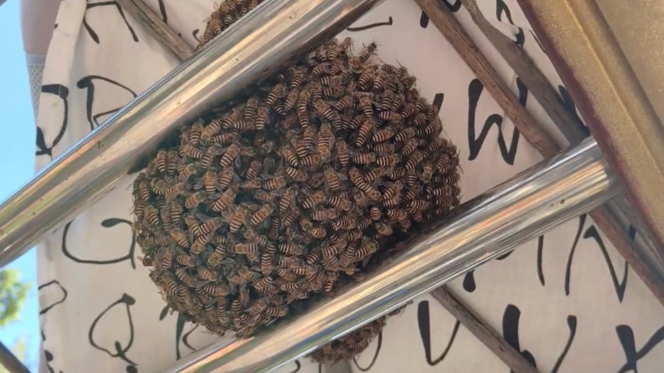 3月13日,广东东莞市民贺女士(化名)称其上午在天台晒枕头,中午发现枕头底下汇聚了一窝蜜蜂。