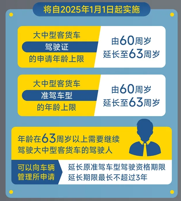年龄在63周岁以上,需要申请继续大型客车(A1)、重型牵引挂车(A2)、城市公交车(A3)、中型客车(B1)、大型货车(B2)、轮式专用机械车(M)、无轨电车(N)和有轨电车(P)的,通过体检和“能力测试(三力测试)”,可以在年满63周岁前一年内向机动车驾驶证核发地或者核发地以外的车辆管理所申请延长原准驾车型驾驶资格期限。延长期限最长不超过三年。